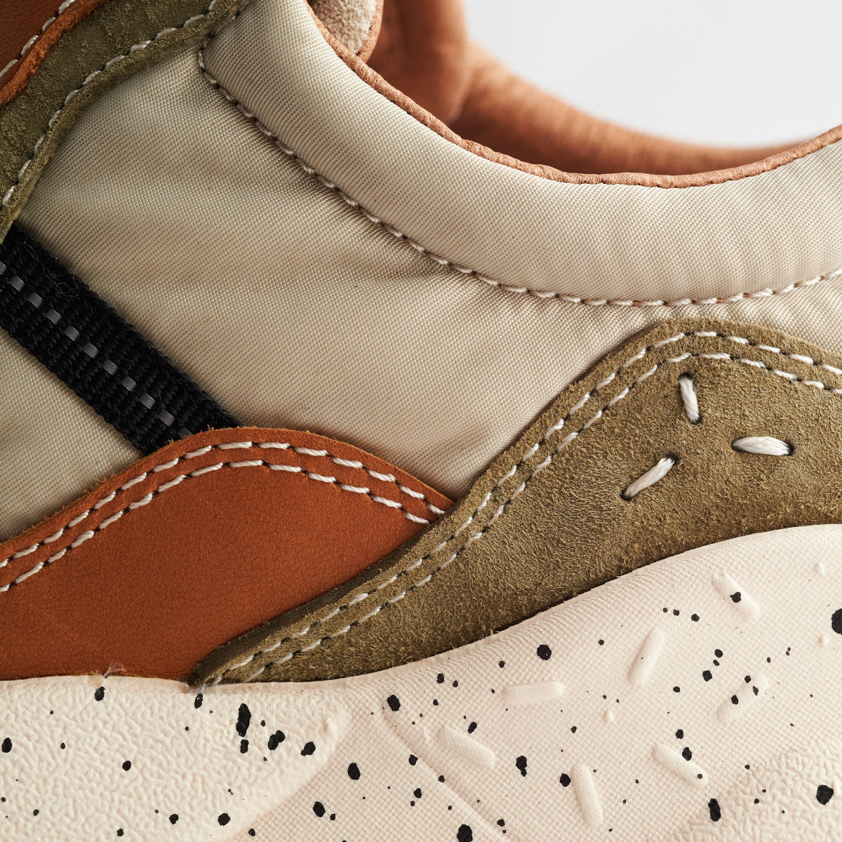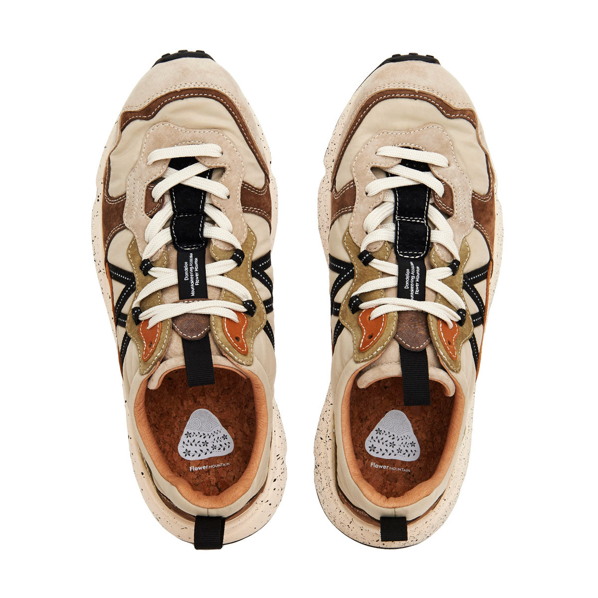 “ LENZAN “は” YAMANO3 “に続くライトウェイトスニーカー。 Flower MOUNTAINの特徴でもある重なり合った有機的な曲線のレイヤーを持つ。2パーツが混ざり合いながら構成されるアイレットステイなど、曲線の美しさを表現したデコラティブでクラフト感を持つスニーカーに仕上がっている。もちろんクッション性に富んだソールや抗菌、防臭性を持つ機能はしっかりと踏襲されている。