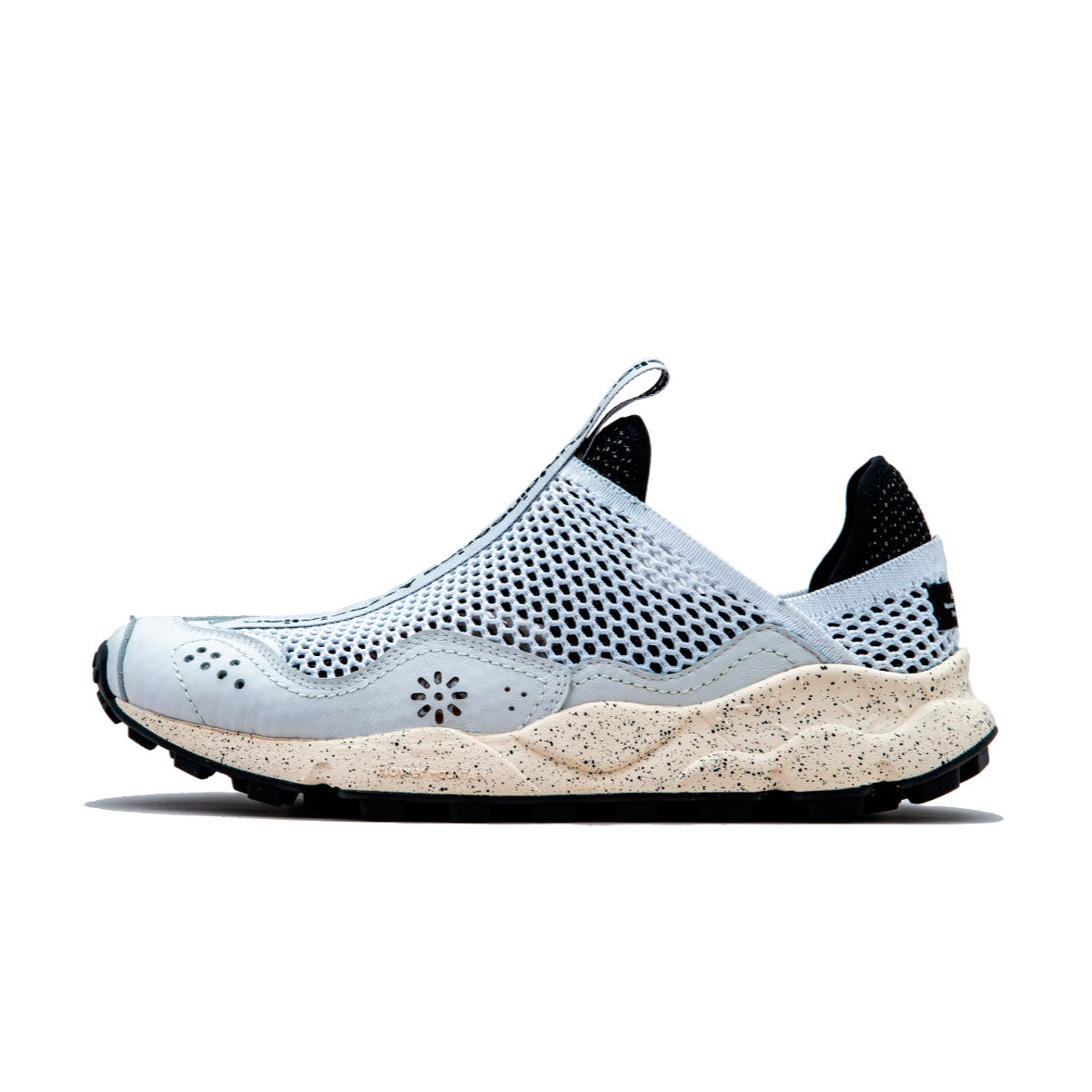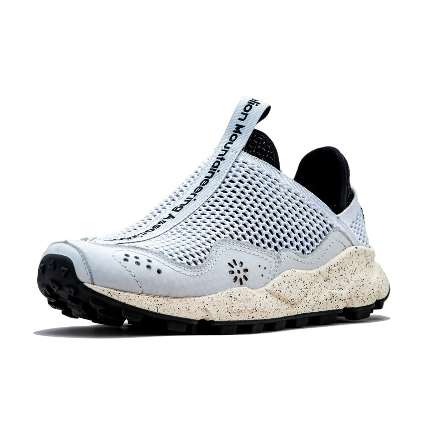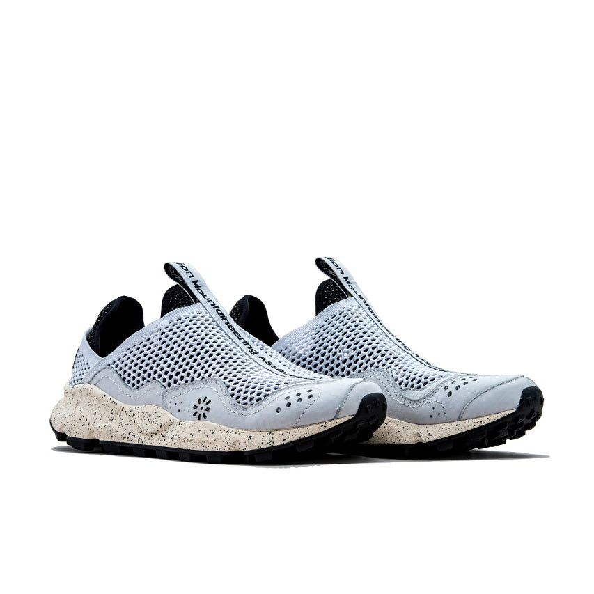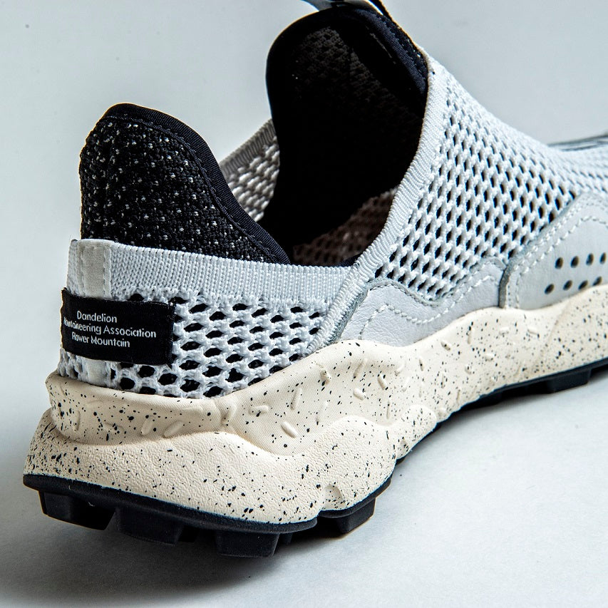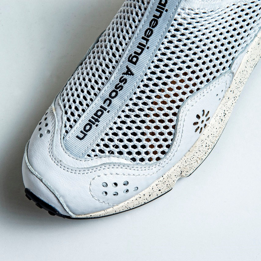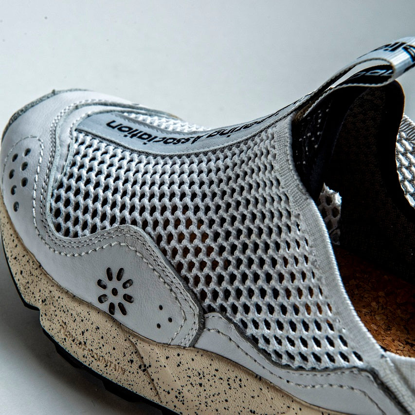 大きな開口部が設けられたストレッチニットのインナーとナイロンネットのアウターという2重レイヤーのアッパーで構成される本モデルは全体〜飾り穴等の細部に至るまで風が通り抜けるイメージで通気と開放にこだわりデザインされている。