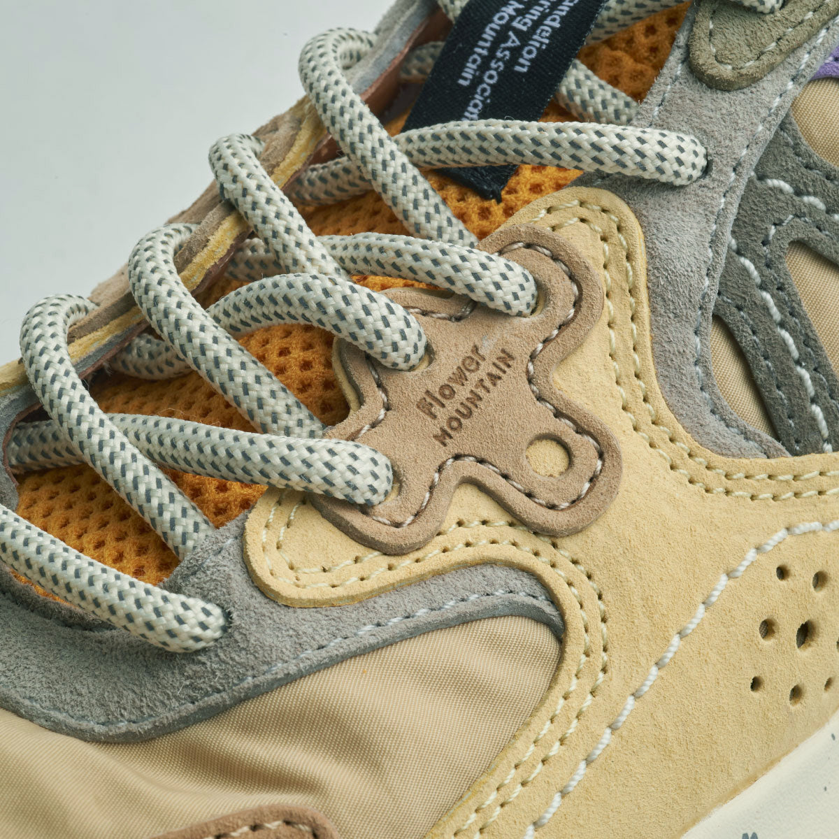 ベージュとグレーのグラデーションがミックスされたアッパーにカーキとパープルのサイドラインがアクセント。落ち着いた雰囲気の中に遊び心のある構成になっている。