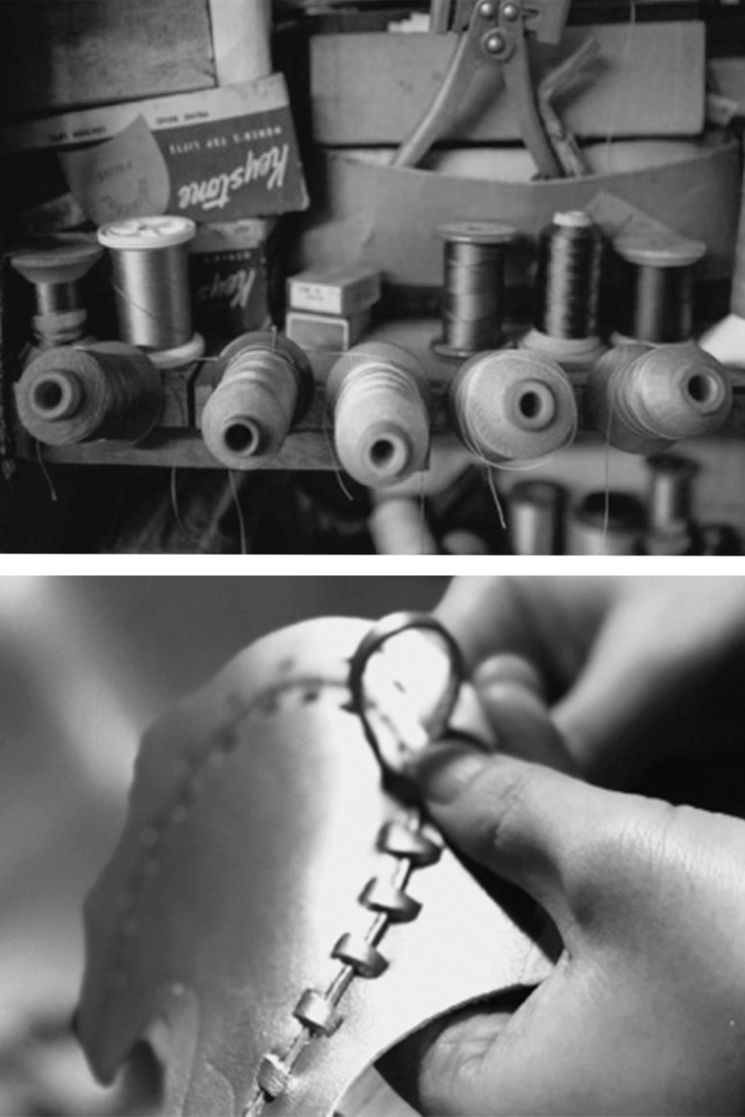 手作業による革紐を使用したステッチワーク、一つ一つ職人が手作業で仕上げる飾り穴。
