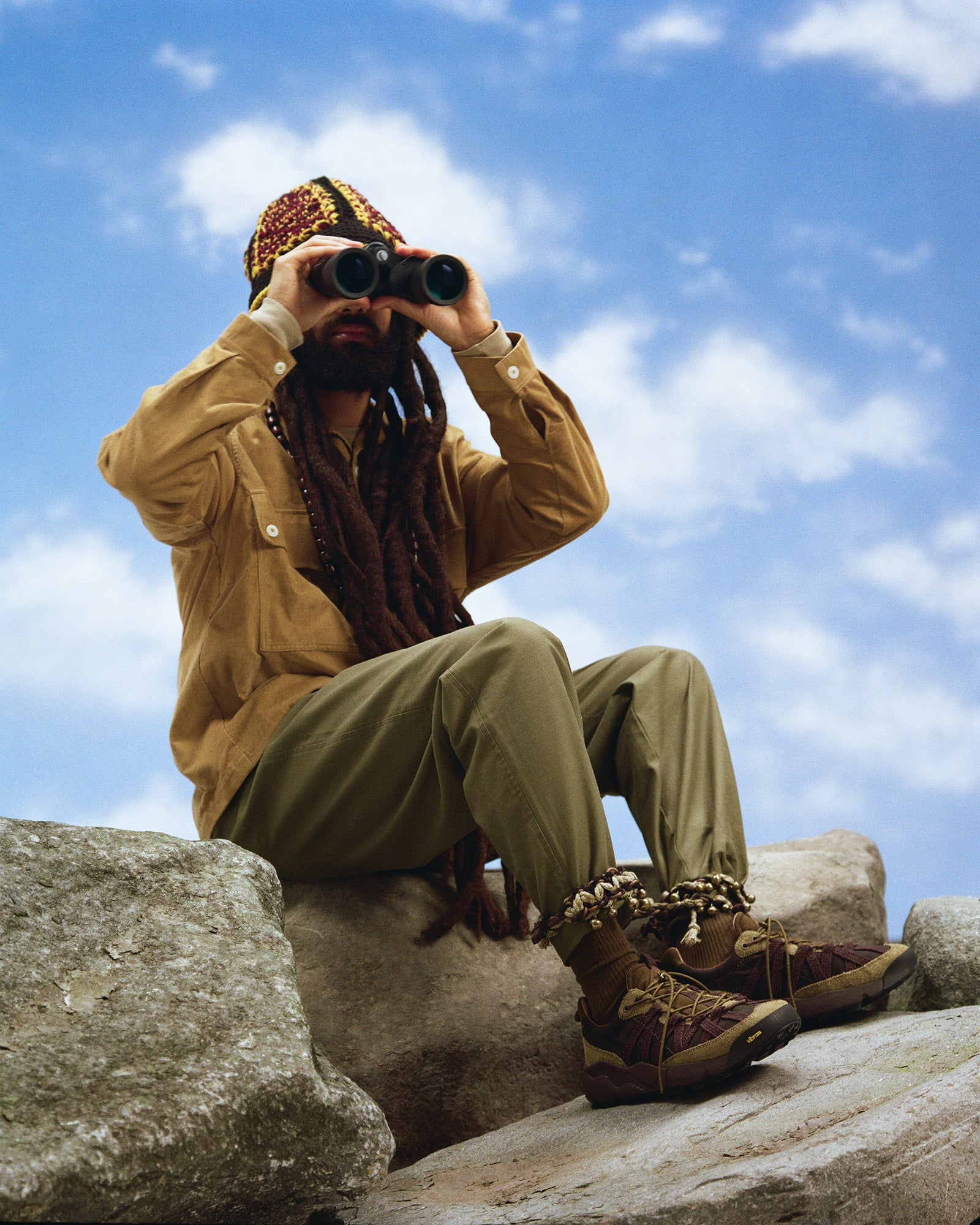 撥水性のある日本製リサイクルナイロンと天然ワックスコットンを組み合わせることで、アウトドアの地形で優れたパフォーマンス特性を実現。ニコラス・デイリーのシグネチャータータンインソール、アンティークブラスのディテール、フラワーマウンテンのシグネチャーデザインのビブラムソールなどで構成されており、その中でも洗練された触感のカスタムコットンヘリンボーンテープレースは注目