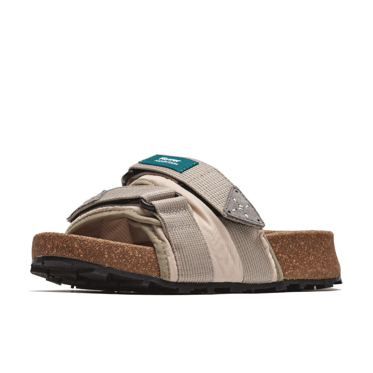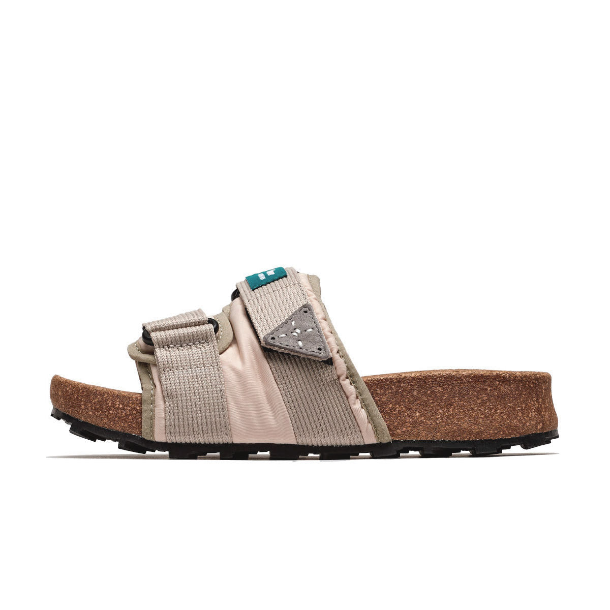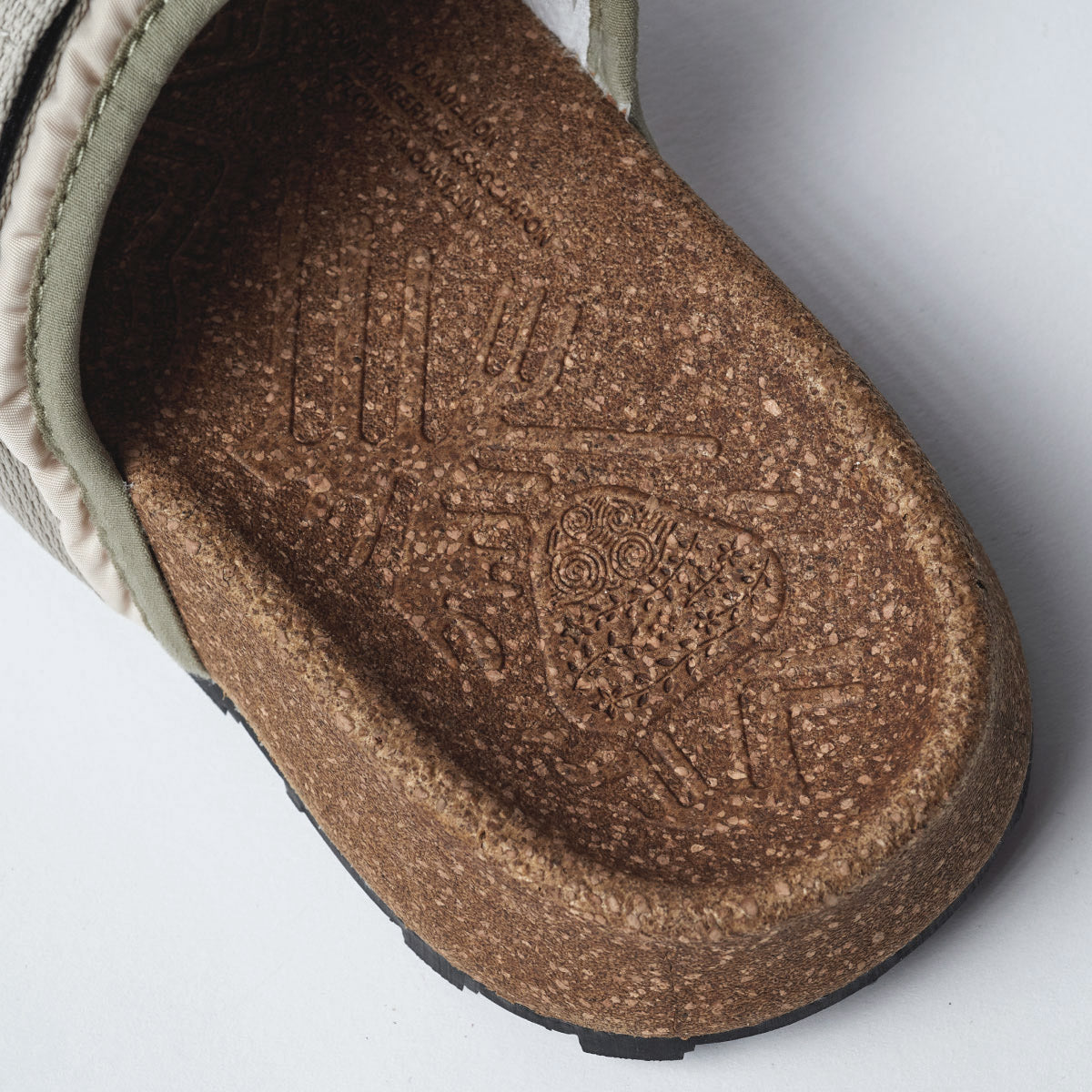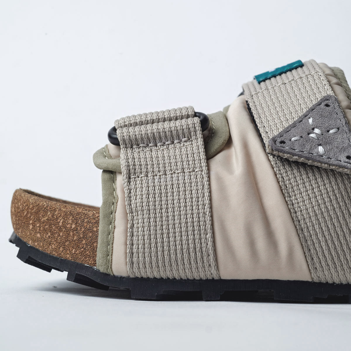EVAフォームを3mm厚のコルクシートでラップしクッション性を出し、厚みを持たせたミッドソールが特徴。 アッパーは甲をダブルストラップで絞める形状になっており、脱ぎ履きが容易で近所へのショッピングや散歩に快適な仕様となっています。