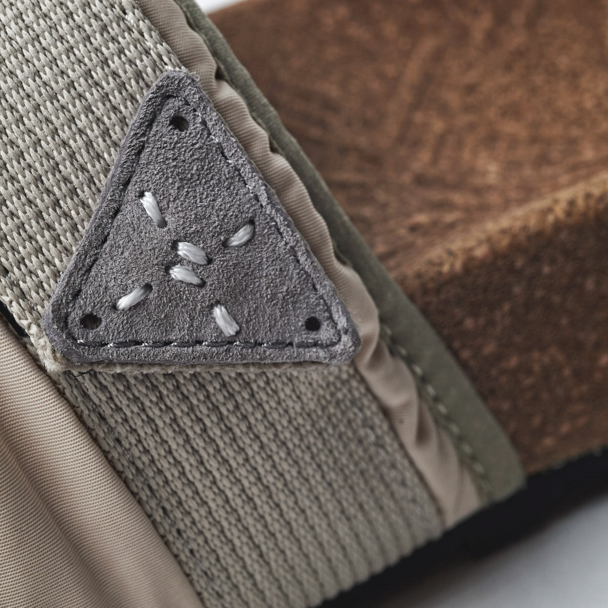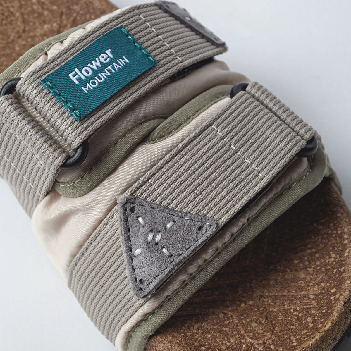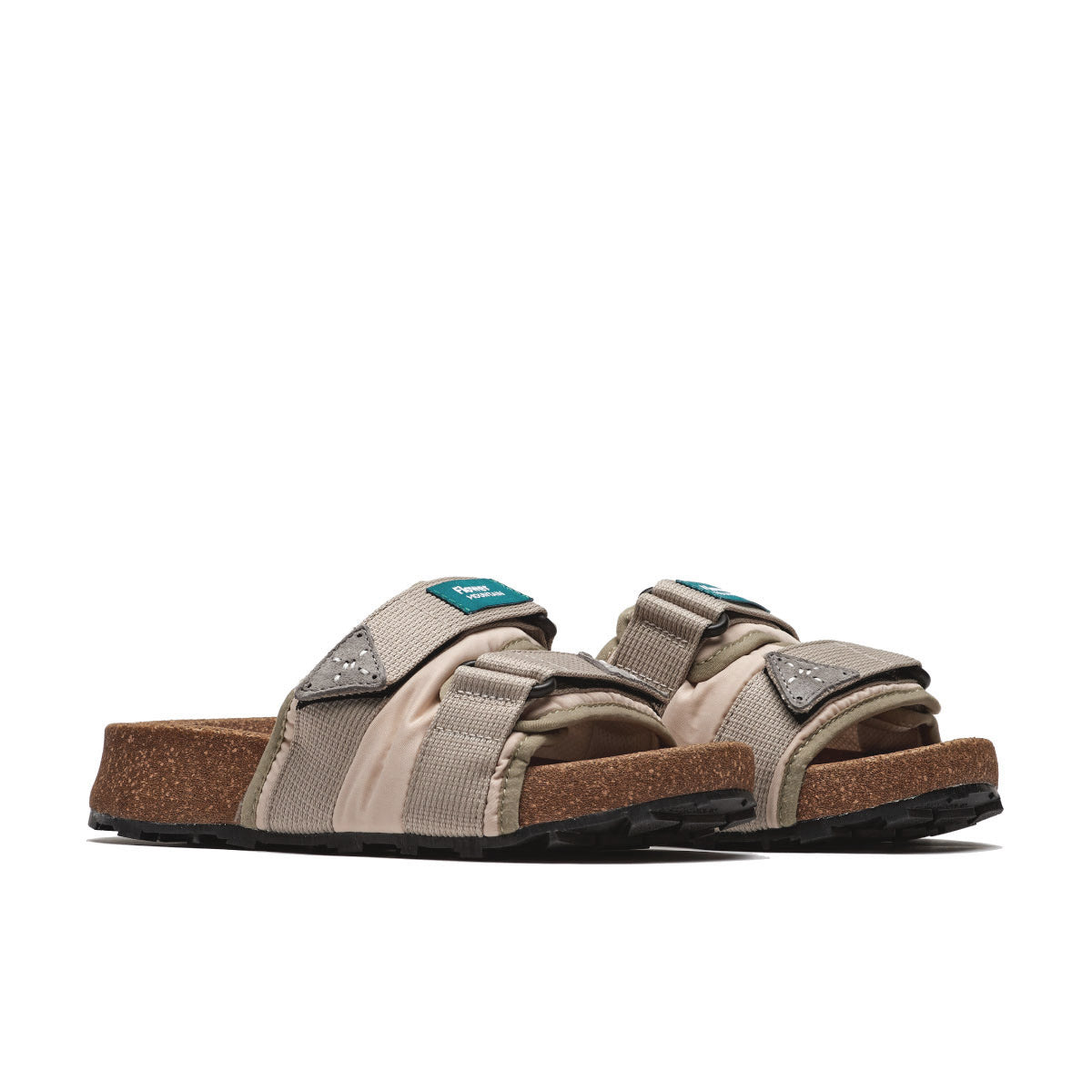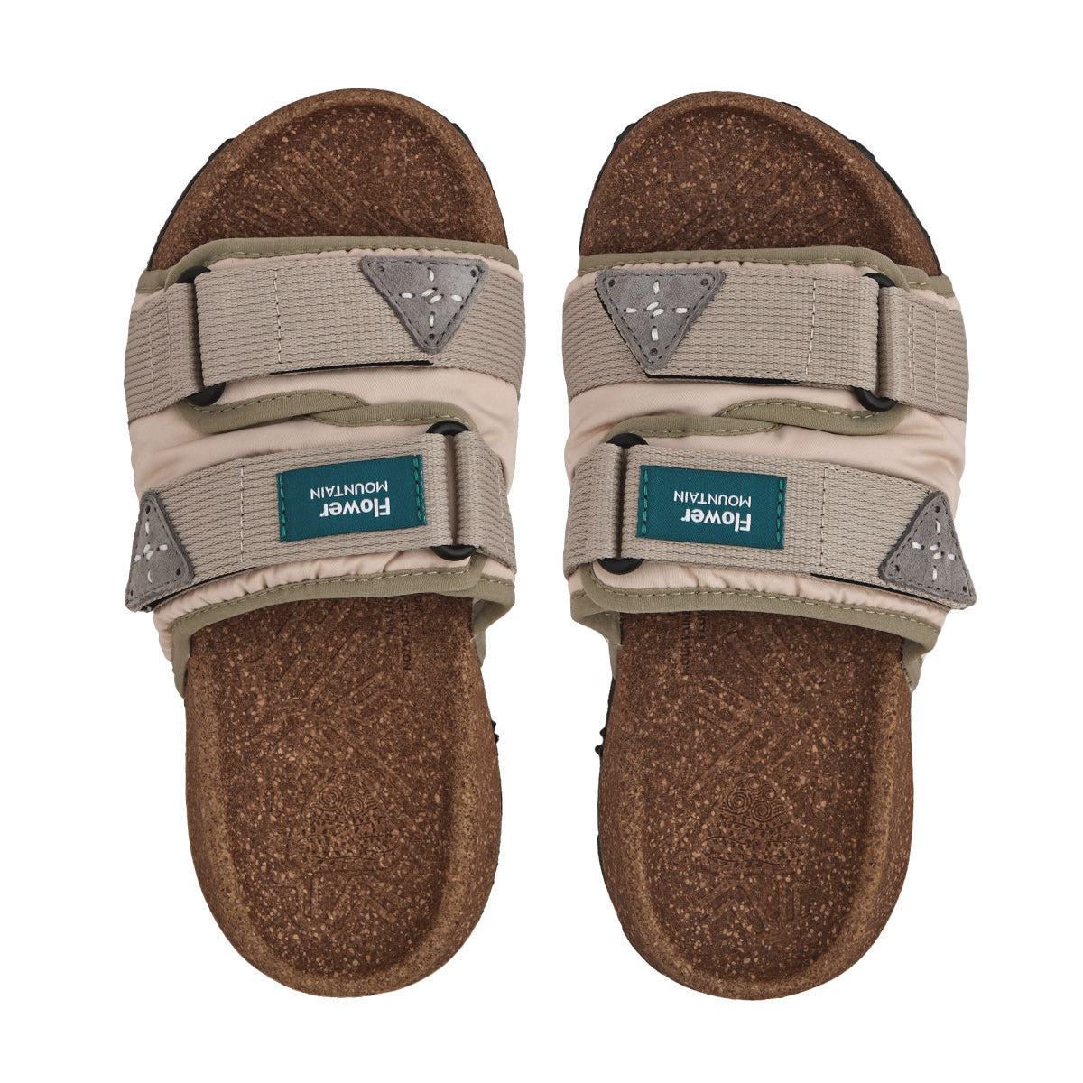 EVAフォームを3mm厚のコルクシートでラップしクッション性を出し、厚みを持たせたミッドソールが特徴。 アッパーは甲をダブルストラップで絞める形状になっており、脱ぎ履きが容易で近所へのショッピングや散歩に快適な仕様となっています。