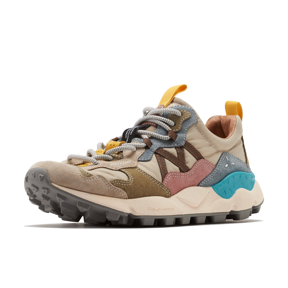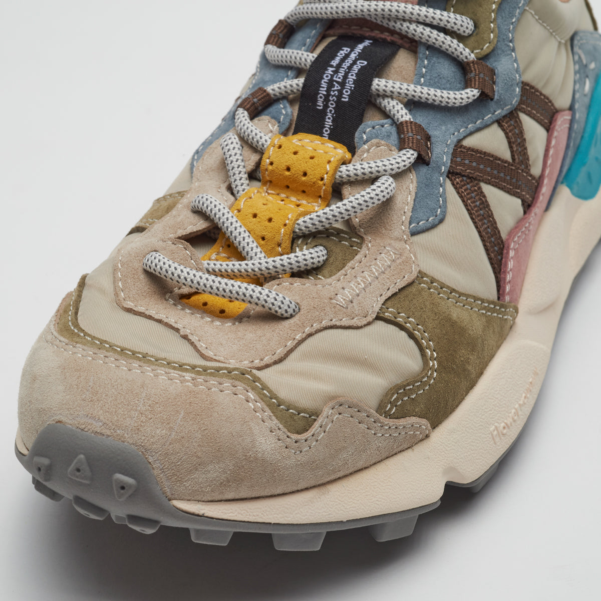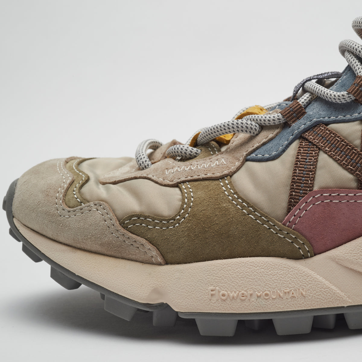 ライトウェイトスニーカー”LENZAN”。 Flower MOUNTAINの特徴でもある重なり合った有機的な曲線のレイヤーを持つ。2パーツが混ざり合いながら構成されるアイレットステイなど、曲線の美しさを表現したデコラティブでクラフト感を持つスニーカーに仕上がっている。もちろんクッション性に富んだソールや抗菌、防臭性を持つ機能はしっかりと踏襲されている。